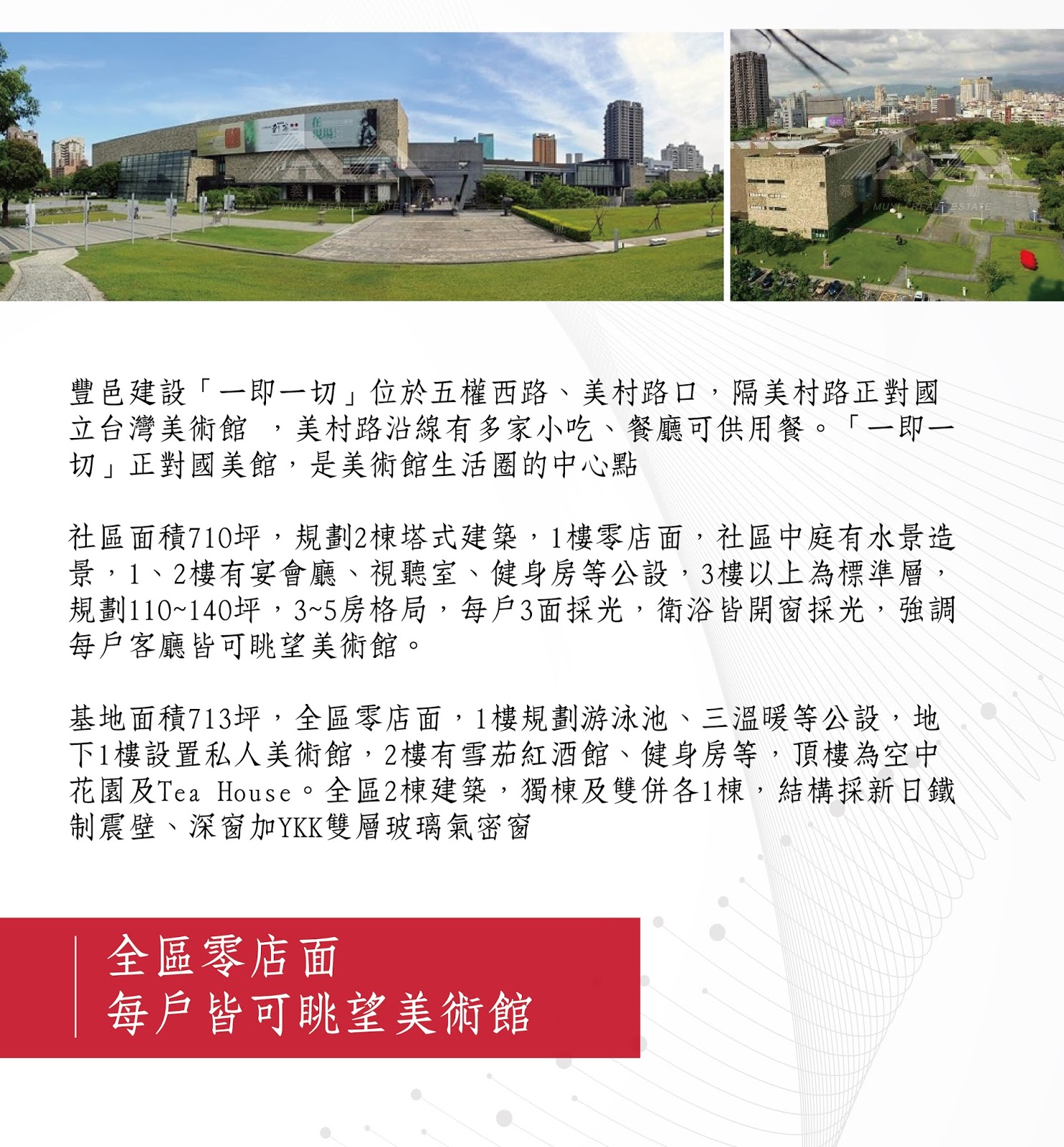 豐邑建設「一即一切」位於五權西路、美村路口,隔美村路正對國立台灣美術館 ,美村路沿線有多家小吃、餐廳可供用餐。「一即一切」正對國美館,是美術館生活圈的中心點